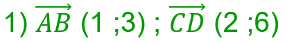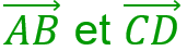 QUESTION-3-Vecteurs QUESTION 3 A ; B ; C et D sont quatre points du plan tels que:A (1 ; 2) ; B (2 ; 5) ; C (2 ; 1) et D (4 ; 7)1) Placer les points A ; B ; C et D par rapport à (O, I, J) orthonormal et calculer les coordonnées des vecteurs .2) Montrer que les droites (AB) et (CD) sont parallèles. QUESTION-3-Vecteurs A ; B ; C et D sont quatre points du plan tels que: A (1 ; 2) ; B (2 ; 5) ; C (2 ; 1) et D (4 ; 7) 1) Placer les points A ; B ; C et D par rapport à (O, I, J) orthonormal et calculer les coordonnées des vecteurs . 2) Montrer que les droites (AB) et (CD) sont parallèles. 2) sont colinéaires donc on a (AB) // (CD). RETOUR AUX QUESTIONS Afficher la réponse Retour aux Questions Retour aux Chapitres Retour aux Matières