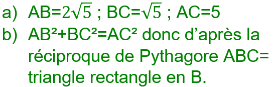 QUESTION-31-Repérage dans le plan QUESTION 31 Le plan P est muni d’un repère orthonormal.On considère les points A (-1; 5) et B (-3 ; -1) C (-5;2).a) Calculer les distances AB ; BC et AC. b) Démontrer que le triangle ABC est rectangle. QUESTION-31-Repérage dans le plan Le plan P est muni d’un repère orthonormal. On considère les points A (-1; 5) et B (-3 ; -1) C (-5;2). a) Calculer les distances AB ; BC et AC. b) Démontrer que le triangle ABC est rectangle. RETOUR AUX QUESTIONS Afficher la réponse Retour aux Questions Retour aux Chapitres Retour aux Matières