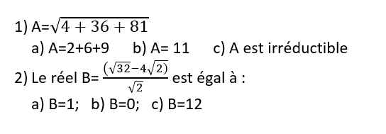 QUESTION-4-ACTIVITES NUMERIQUES : Racine carrée QUESTION 4 Choisis la bonne réponse de : QUESTION-4-ACTIVITES NUMERIQUES : Racine carrée Choisis la bonne réponse de : 1.b) A = 11 2.b) B = 0 RETOUR AUX QUESTIONS Afficher la réponse Retour aux Questions Retour aux Chapitres Retour aux Matières