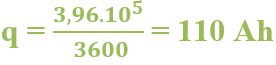 La quantité d’électricité d’une batterie d’accumulateurs pour voilure est q = 3,96 ; 105 C. Trouvez la quantité d’électricité en Ah.